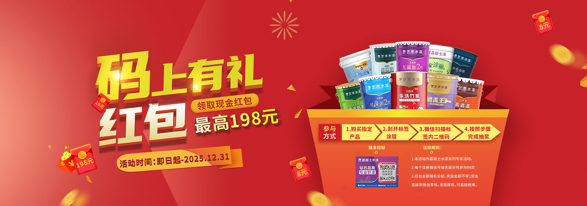 嘉麗士水漆?推出 “碼上有禮” 紅包活動(dòng),最高可領(lǐng)198元!不管是1.8 元、5.8元,38元,還是超級(jí)幸運(yùn)的198 元,每一個(gè)紅包都是嘉麗士水漆對(duì)大家的誠(chéng)意與回饋。